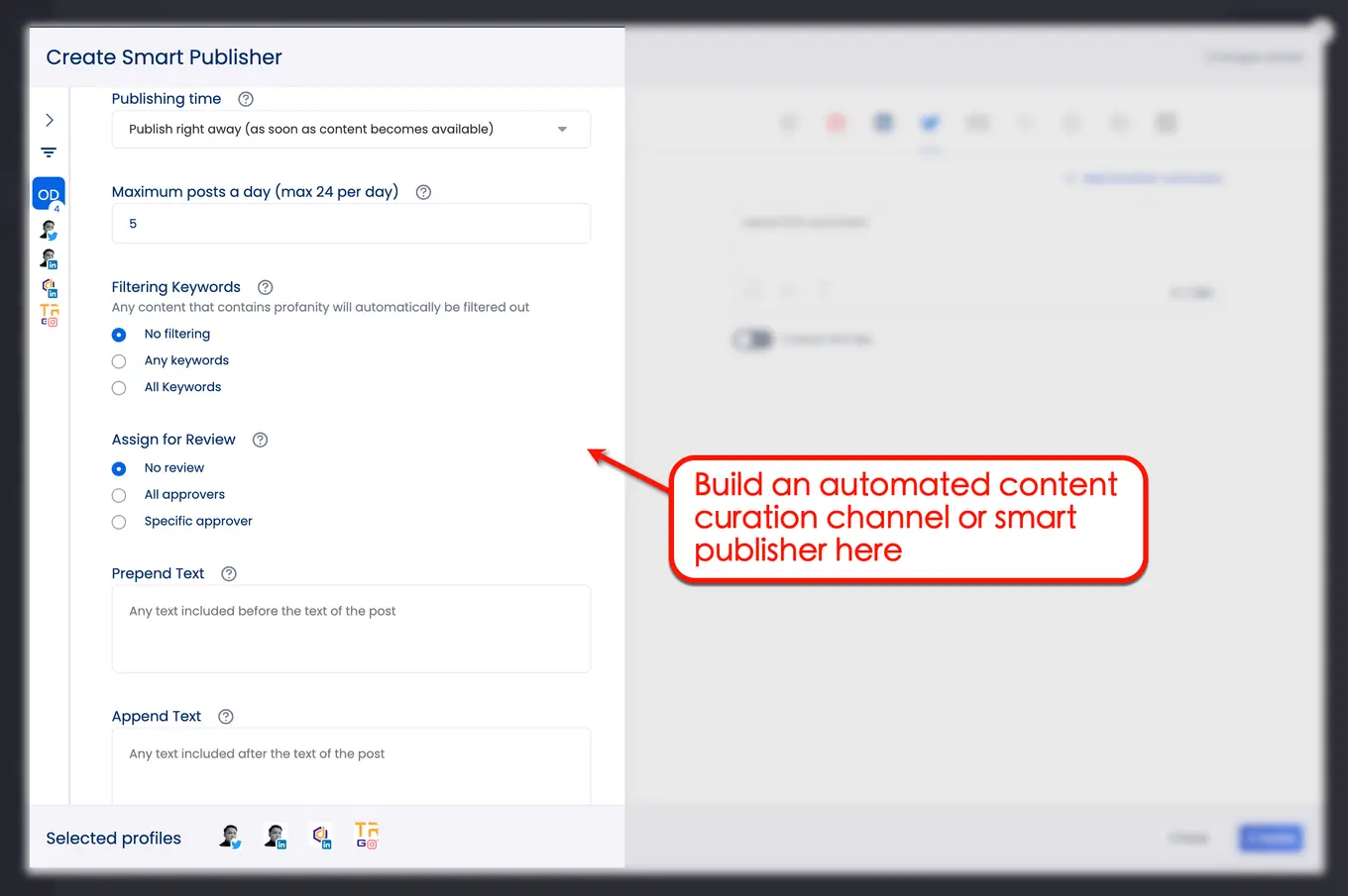 Finally, use the “Smart Publisher” feature to create an automated content curation channel from news sites or blogs.