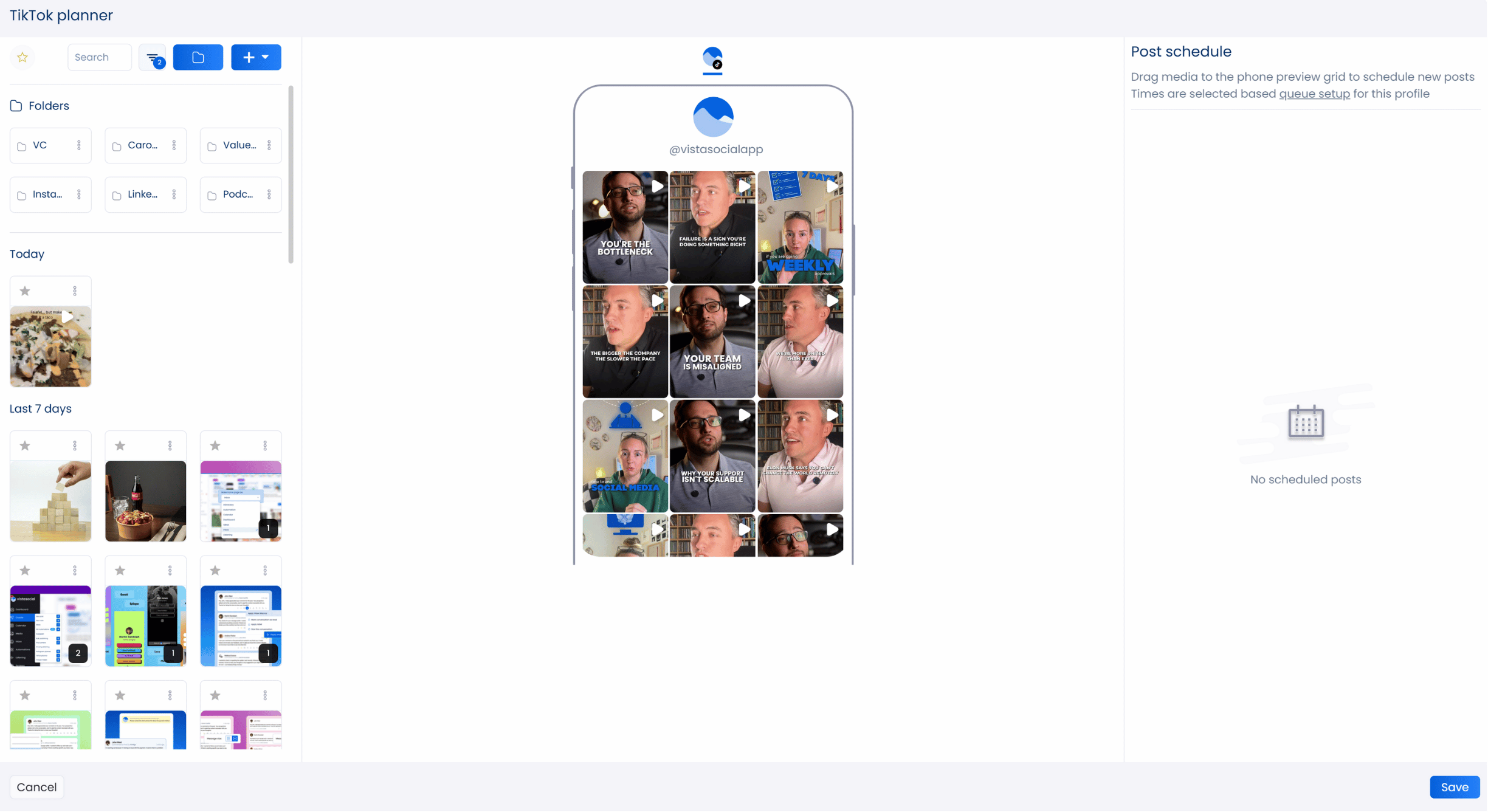 Vista Social gives you the core publishing tools you need, along with advanced features that make high-volume posting far more manageable. Use the Vista Social Visual TikTok Planner to organize your scheduled videos for auto-publishing using a drag-and-drop tool.