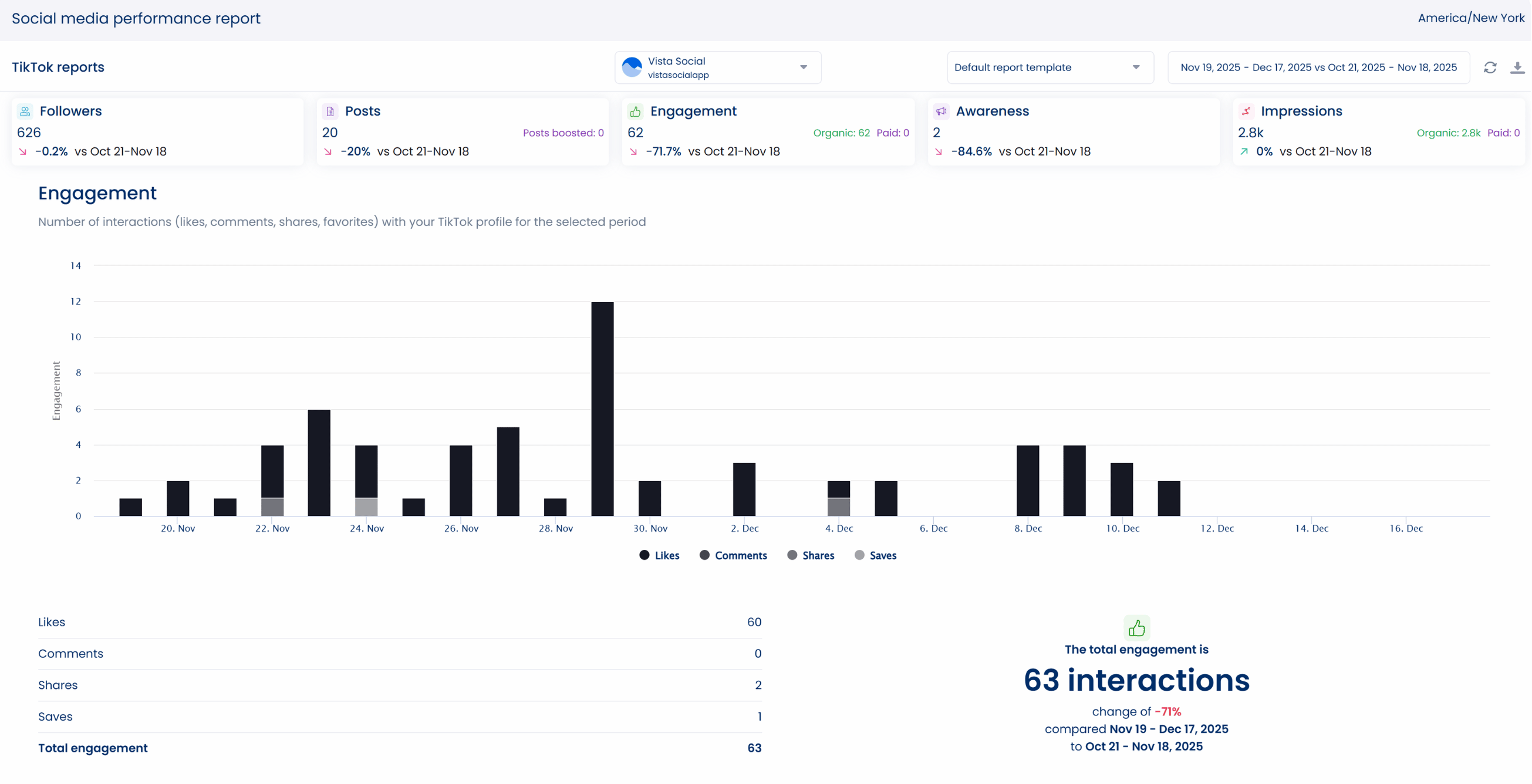 You can also use all-in-one social media management tools such as Vista Social’s TikTok analytics feature to gain valuable insights. Through visual reports and charts, the platform helps you quickly spot engagement patterns across key audience interactions.